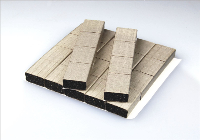 在阻燃海绵上包裹导电布,经过一系列的处理后,使其具有良好的表面导电性,可以很容易用胶粘带固定在需屏蔽器件上。