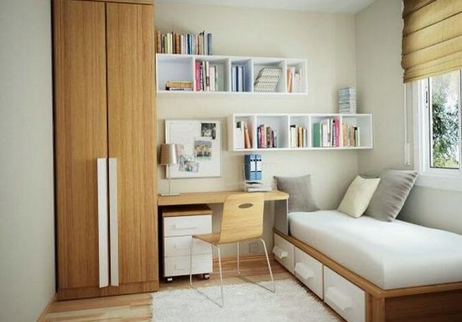 小卧室设计时着重考虑的又一点便是空间如何合理地运用。为了增强小卧室的空间利用率,可考虑在每个能够充分利用的区域布置具有收纳功能的储物物品。如在墙面上安装置物架、采用能够藏物的高箱床等。
