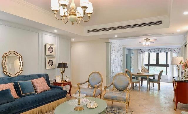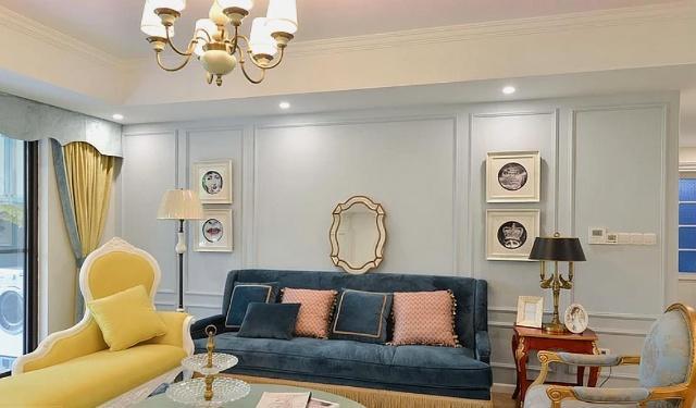 墙面没有做什么复杂的装饰,粉蓝色乳胶漆涂刷,细致石膏线条铺贴,框出一圈一圈的层次感来。搭配精致的简约法式家具,太漂亮了!邻居来参观,都夸我媳妇有品位,我也觉得颇有面子!