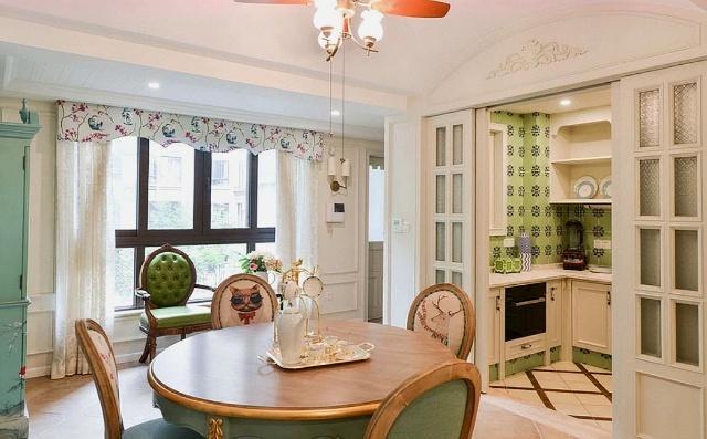 走进来后是我家餐厅,餐厅实在太美了!原谅我没有太多词汇用来形容,这种粉蓝色的格调让人陶醉痴迷,相信即便是一个铁汉,内心也会被这漂亮的装修暖化。复古质感的餐桌椅耐看精致,餐桌还有一圈金色的沟边。整个硬装搭配家具就像回归自然了一般,连空气似乎都变得温馨了!