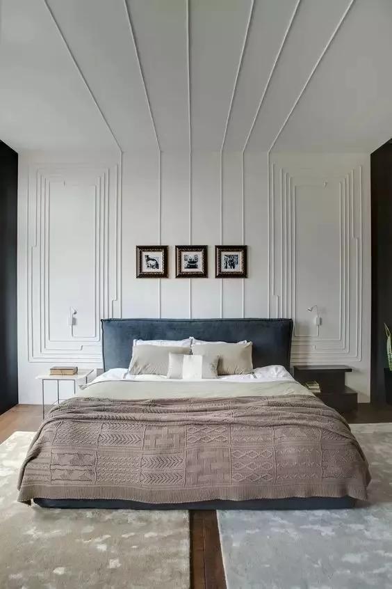 又或者你可以把这些裁切后的石膏板线条做成护墙板。这样的方法不仅看起来很个性,而且效果也特别好看,比用木制的护墙板装修还更省预算。另外还可以再搭配一些色彩丰富的涂料,这样即显得高档又简单典雅。